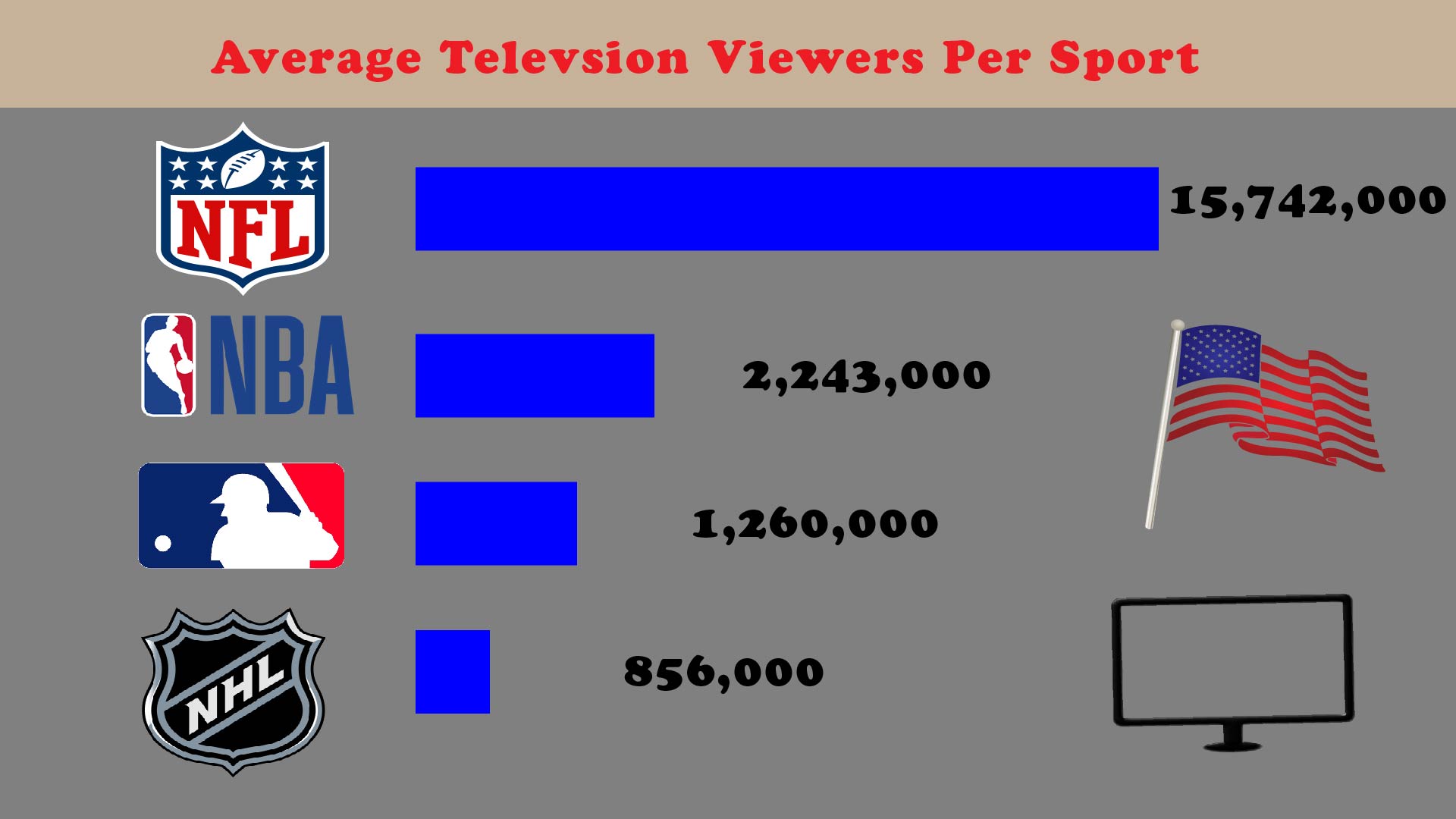 I decided to highlight my information by showing bar graphs of the average number of viewers per game per sport. I chose to do this because I wanted to show how much larger the popularity and interest is for football over all 3 of the other sports. As you can see, the NFL has quite a substantial lead.